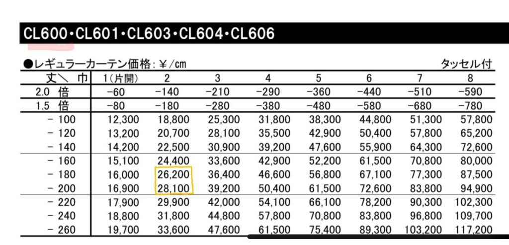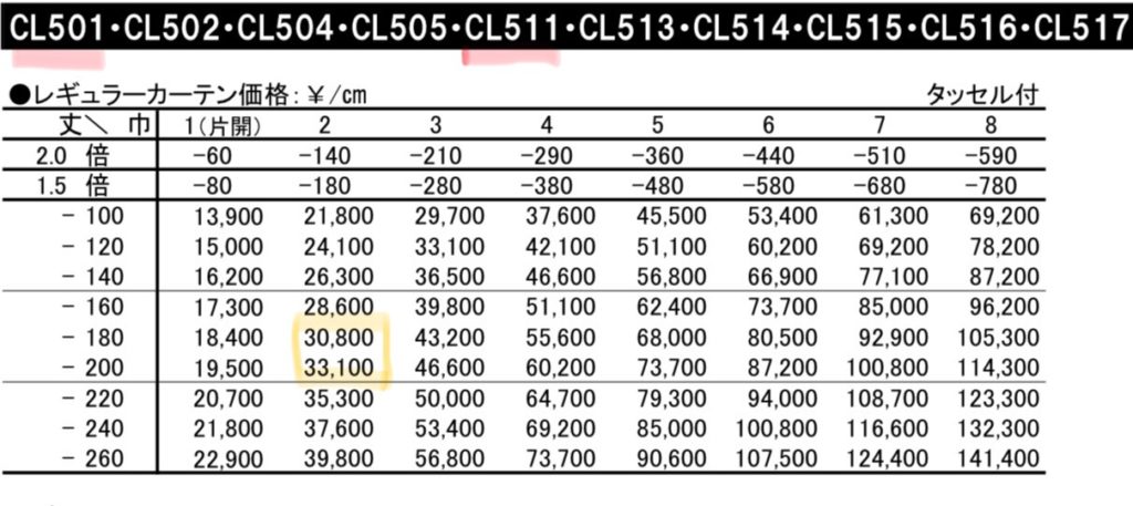 ▼一つ山縫製カーテン オーダー価格 (税別)