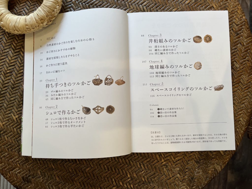 はじめての方でもかごが作れるよう、道具や素材の説明から始まり、数種類のカゴの作り方が、とても詳しく載っています。